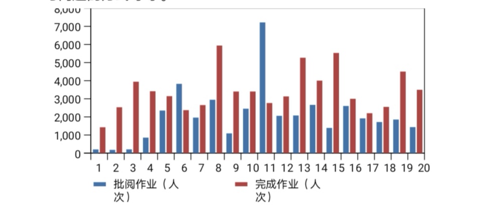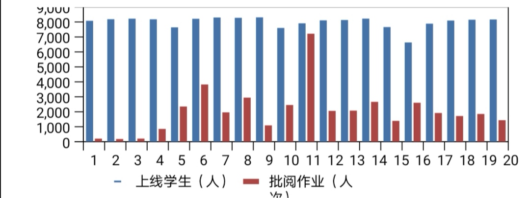 如下图,在超星平台上学习的学生人数平均在8000左右,约占我校本科生总人数的50%。前4个教学周当中,教师批阅作业总量为40994人次,平均每名教师每周批阅量为58.6份,约为两个自然班的学生总数。
