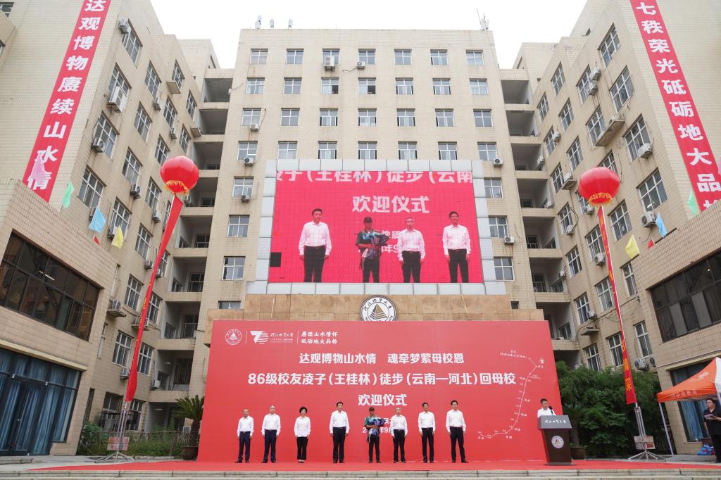 在喜迎河北地质大学建校70周年华诞之际,我校86级校友王桂林(笔名凌子),自2022年8月13日从云南楚雄启程,历经149天的风雨兼程,于10月9日徒步抵达母校宣化旧址,为建校70周年华诞献礼。我校在宣化旧址举办终点欢迎仪式暨河北地质大学第七届山海论坛。宣化区委书记张聪,宣化科技职业学院党委书记冯文利,中国地质调查局水文地质环境地质调查中心党委书记、校友张发旺,河北地质大学校长和志强、副校长冯鸿雁、王滨出席欢迎仪式。欢迎仪式由王滨主持。 欢迎仪式现场 校长和志强致欢迎辞 和志强致欢迎辞。他表